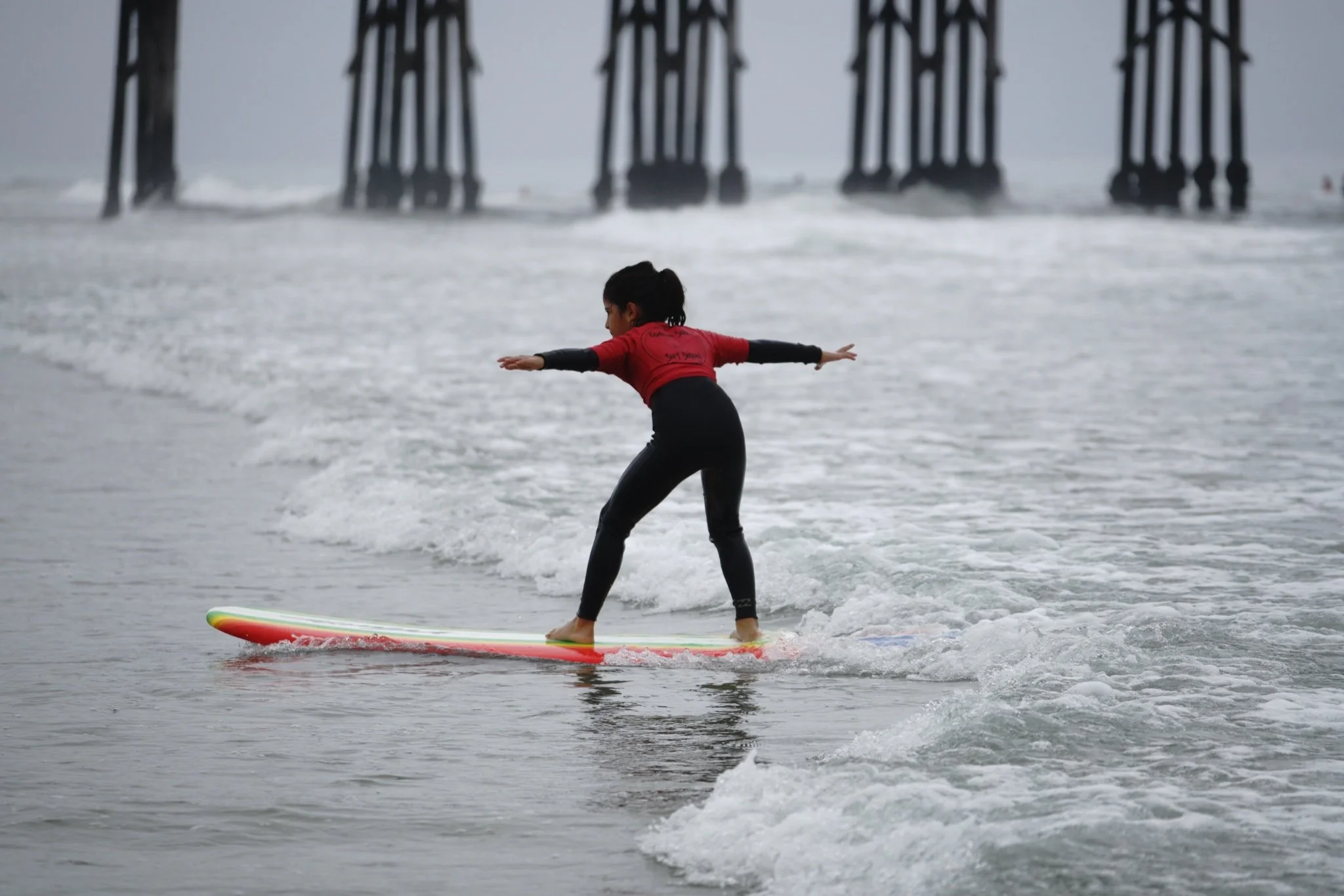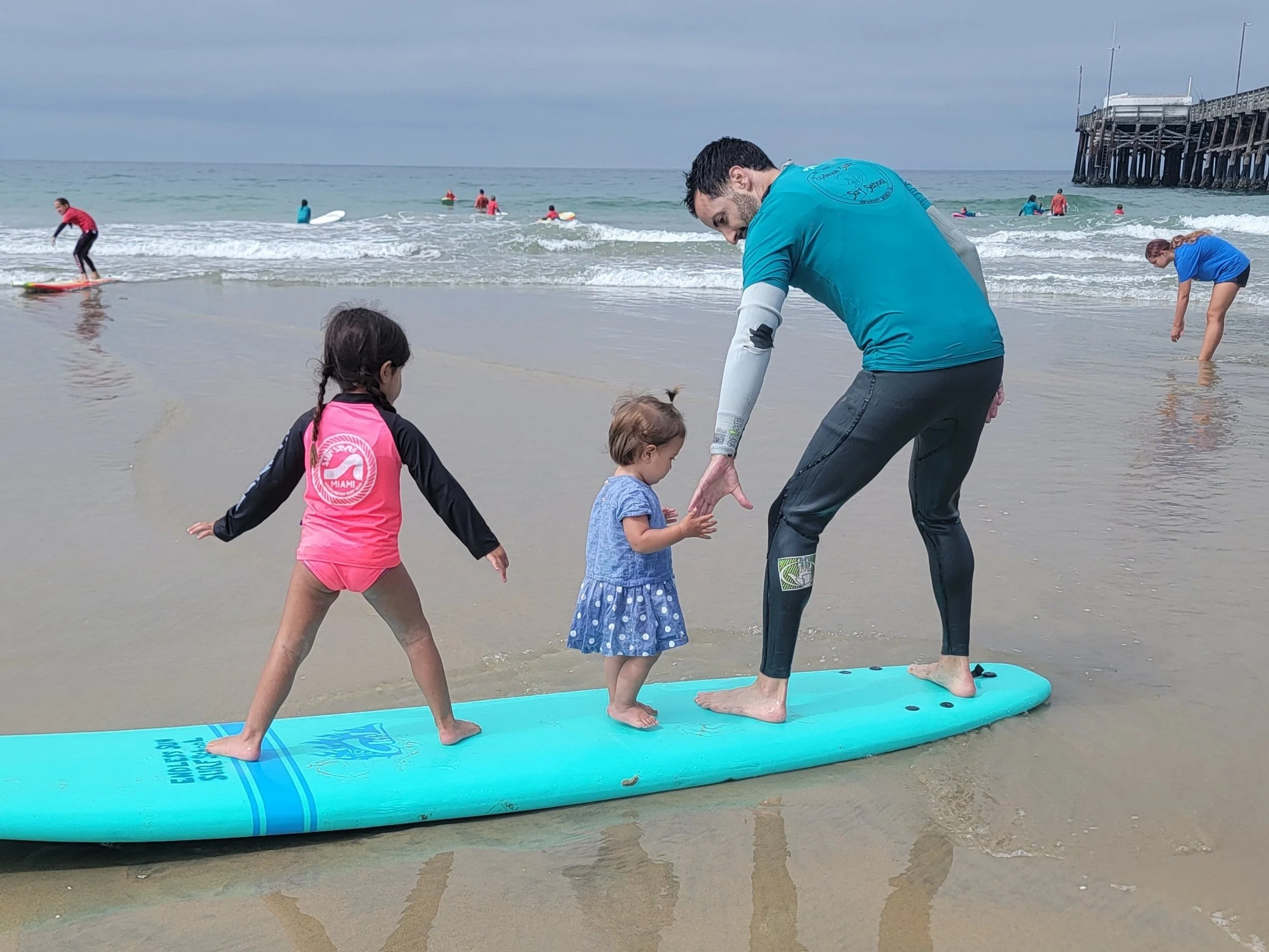 Established in 1963, Endless Sun Surf School is Newport Beach's original surf school. We've taught thousands of people, of all ages and abilities, how to surf, at one of California's best learning beaches, the Newport Pier. Our CPR-certified teachers are also professional surfers who have an in-depth knowledge of the sport and a passion that they wish to share with you! We always provide wetsuits and surfboards for all sizes. Voted Orange County's BEST SURF CAMP for many years in a row (Parenting OC Magazine)! Established in 1963, Endless Sun has taught thousands of people of all ages how to surf; and is family owned and operated by Tim and Amy Reda, WSL professional surfers who are both extremely knowledgeable and passionate about surfing. In this camp, professional surf instructors will teach kids and adults of all levels how to surf or improve their surfing, at a fun and very safe, beginner beach. Your time with us is spent in the water, gaining skills and confidence. Students will learn ocean awareness, safety, paddling techniques, how to catch and ride waves, how to turn, surf etiquette, and more. We can't wait for another amazing summer! Beach instruction includes water safety and surfing etiquette plus proper "pop-up" and paddling technique. By the end of the first day students will be putting all of the learned components together, catching and riding your first waves! As the week progresses you will develop your skill level and water awareness, and by week's end your goal is to independently judge, catch and ride waves with progressing maneuvers. Comraderie in the water and the excitement of advancement will be a life changing experience for you! This class is intended for anyone age 6 & above (Adults love to join in too!).
