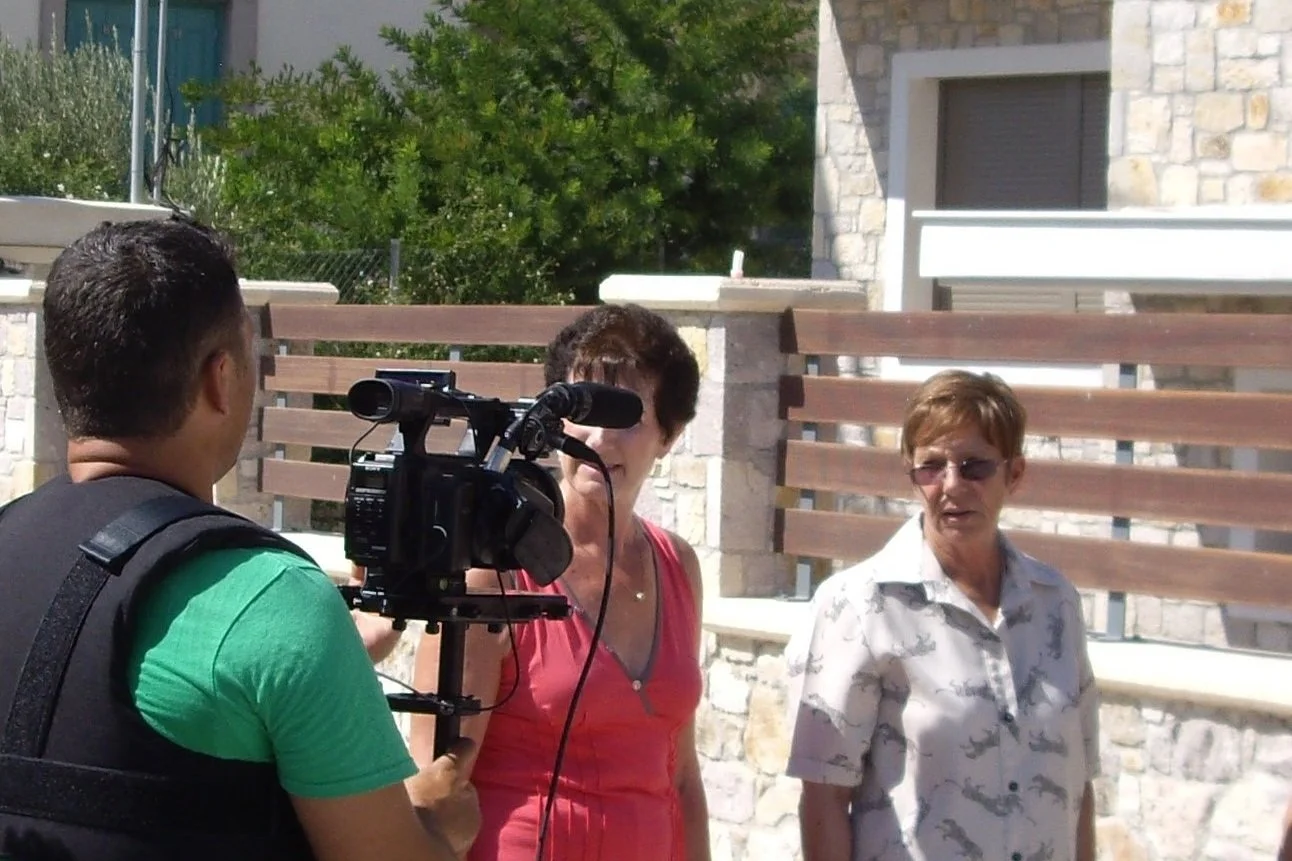 Filming the TV show, Hellenic Home Hunting with the crew in Mytilene (Lesvos), Greece. With the local real estate agent and the potential buyer, Helen Robinson, from Australia.