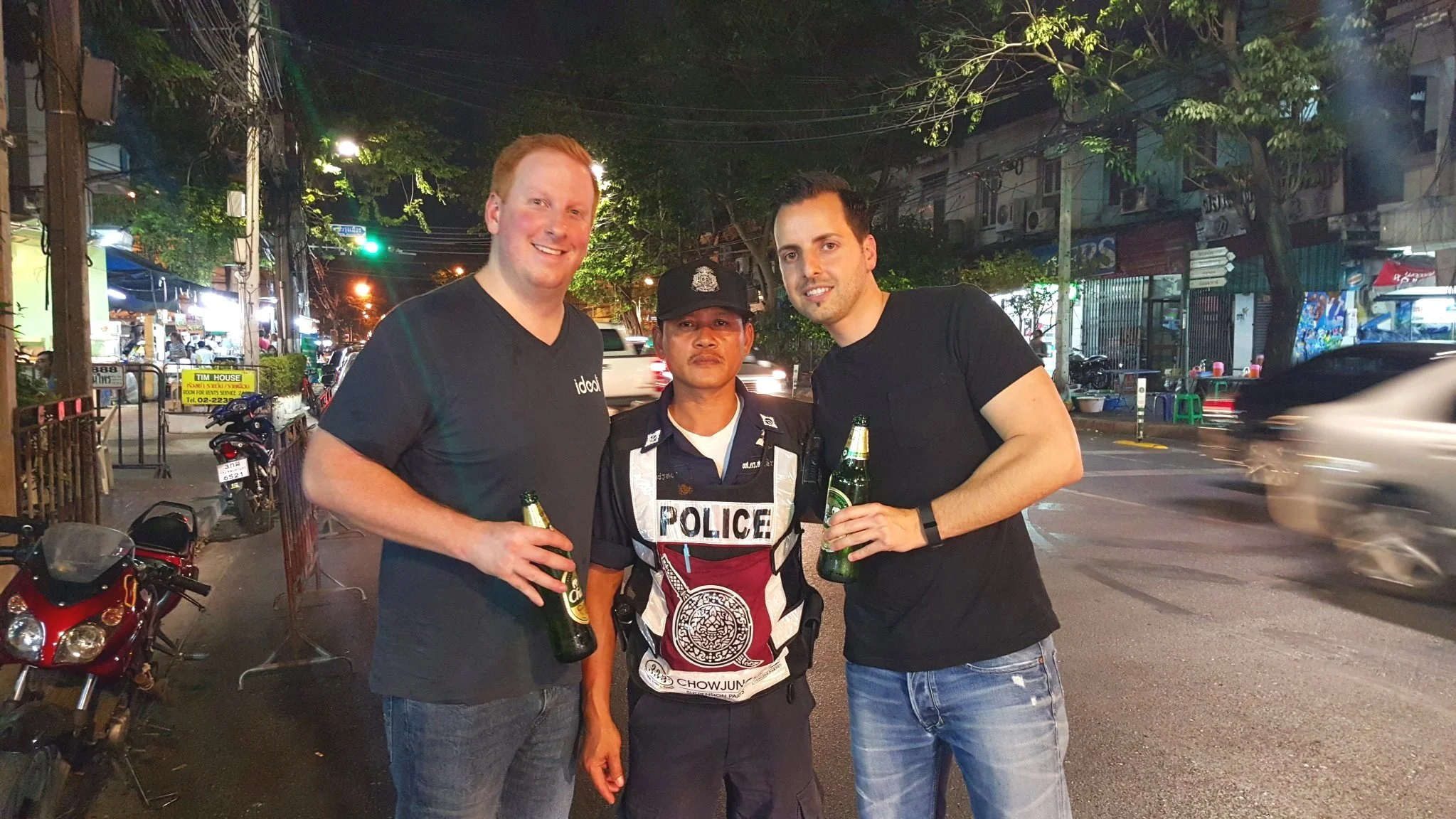 Drinking and enjoying the sights and sounds of Bangkok, Thailand. Not getting arrested here by the policeman.