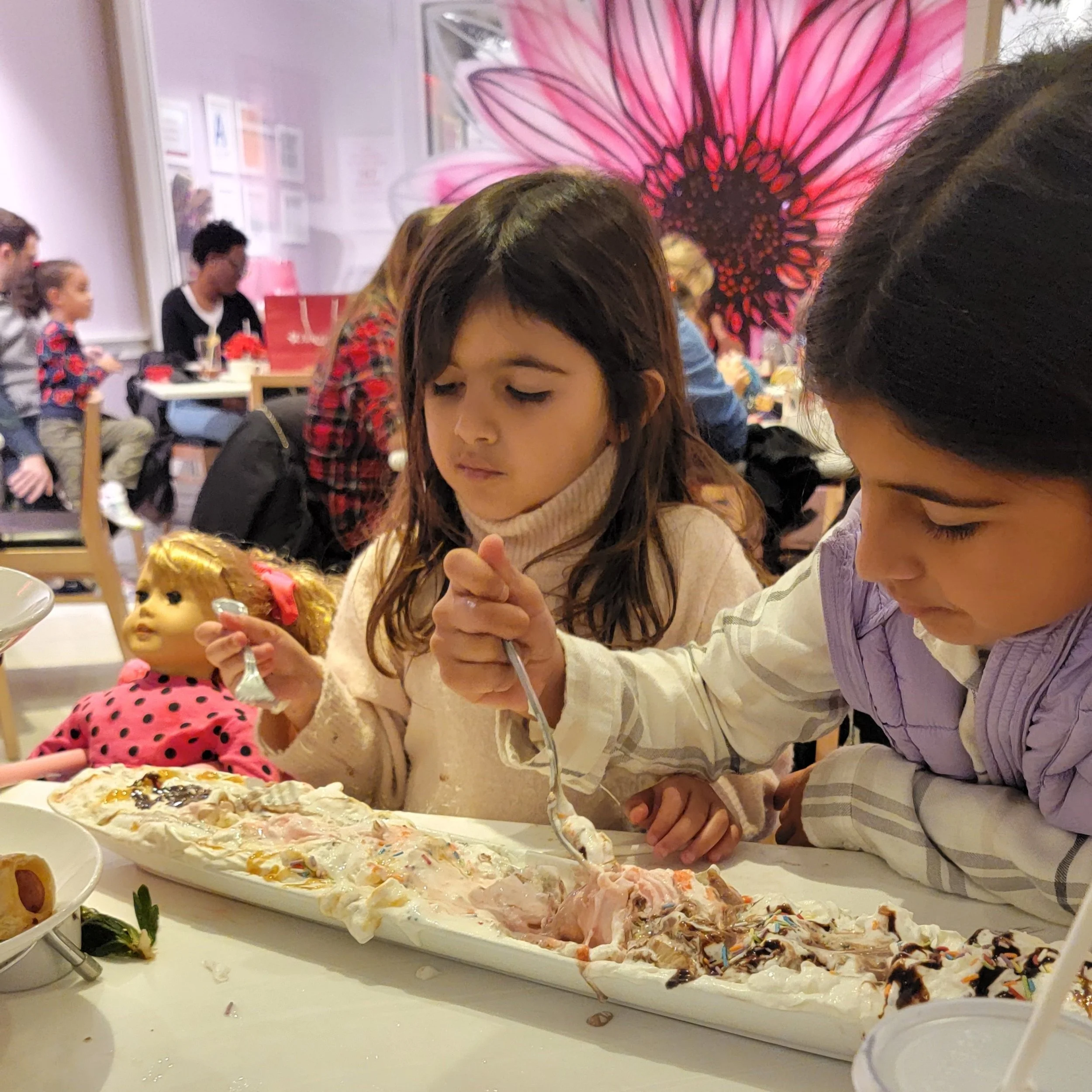 My daughters indulging in the massive ice cream sundae in between shopping.