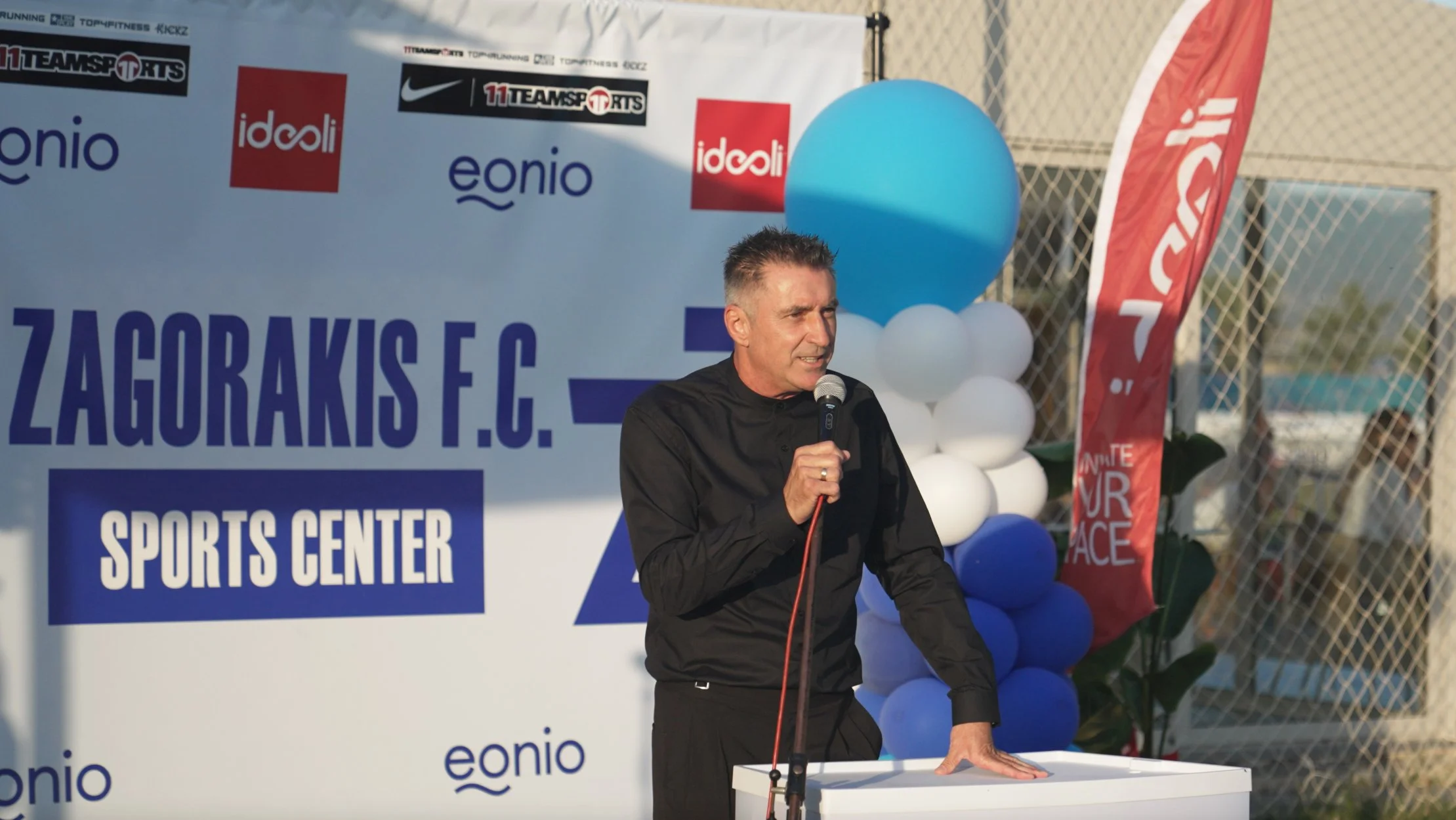 Καλησπέρα και καλωσορίσατε στο Zagorakis Sport Center που σήμερα έχει τα εγκαίνιά του. Πρόκειται για έναν χώρο 80 στρεμμάτων, με επτά γήπεδα φυσικού χόρτου — χωρίς πλαστικό — με οικολογικό αποτύπωμα, δέντρα, υπαίθριους χώρους, δύο υπαίθρια και ελεύθερα πάρκινγκ, έξι γήπεδα φυσικού χλοοτάπητα και επτά πολυχώρους/χώρους προπόνησης. Είναι μια μαγική στιγμή, σχεδόν είκοσι χρόνια μετά το 2004, όταν ο μεγάλος αρχηγός μας μας έβγαλε στους δρόμους υψώνοντας την ελληνική σημαία στο Euro. Σήμερα είναι μαζί μας φίλοι όπως ο Καραγκούνης, ο Σαλπιγγίδης, ο Καφές και πολλοί ακόμη που στηρίζουν την προσπάθεια. Παράλληλα, έχουμε ήδη στήσει τη Zagorakis FC και την Ακαδημία Z7, ένα μη κερδοσκοπικό σωματείο που δημιουργήθηκε από φίλους του Θοδωρή Ζαγοράκη. Η Ακαδημία Ζ7 έχει ήδη 160 εγγεγραμμένα μέλη. Είμαστε πολύ χαρούμενοι που έχουμε πολλούς υποστηρικτές — μεταξύ αυτών την εταιρεία φωτισμού Ideoli, τον μεγαλύτερο υποστηρικτή μας — και τους ευχαριστούμε θερμά. Αυτούς τους υποστηρικτές όχι μόνο τους χρειαζόμαστε, αλλά θέλουμε να είναι πάντα δίπλα μας, γιατί φιλοδοξούμε να κάνουμε σπουδαία πράγματα. Εύχομαι να περάσουμε όλοι όμορφα με το ωραίο λαϊκό πρόγραμμα που έχουμε αμέσως μετά. Ευχαριστούμε πάρα πολύ.