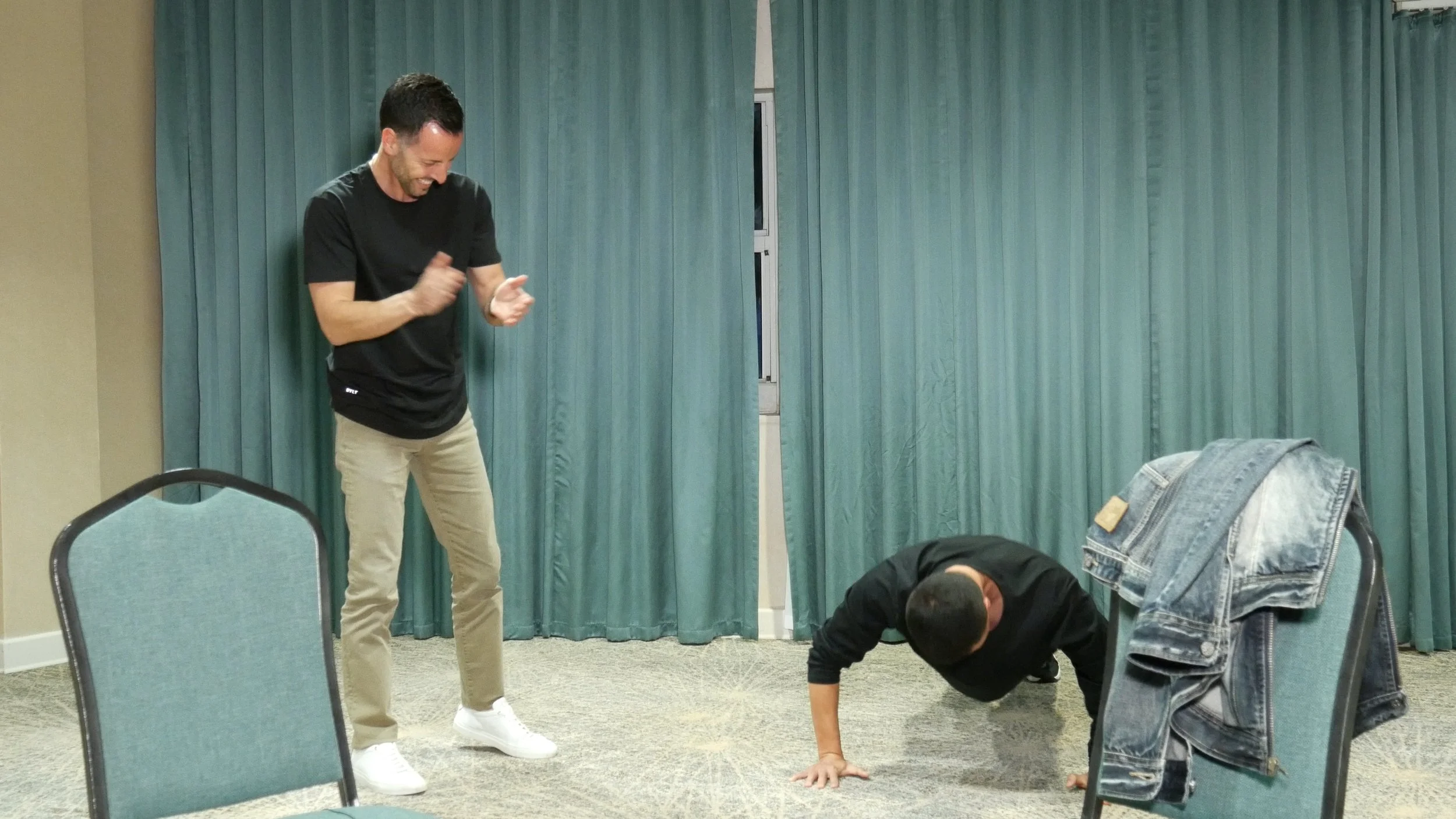 So to everybody we're going to go, because you're my motivation now to be able to do more. Yeah, yeah, let me take a try, let's go. So yeah, you could just leave it on the floor, that's okay. So we're going to have a push-up, Not even a competition. Let's get to 50. Ready, so let's go. We can see us right here. So you're going to go this way.
