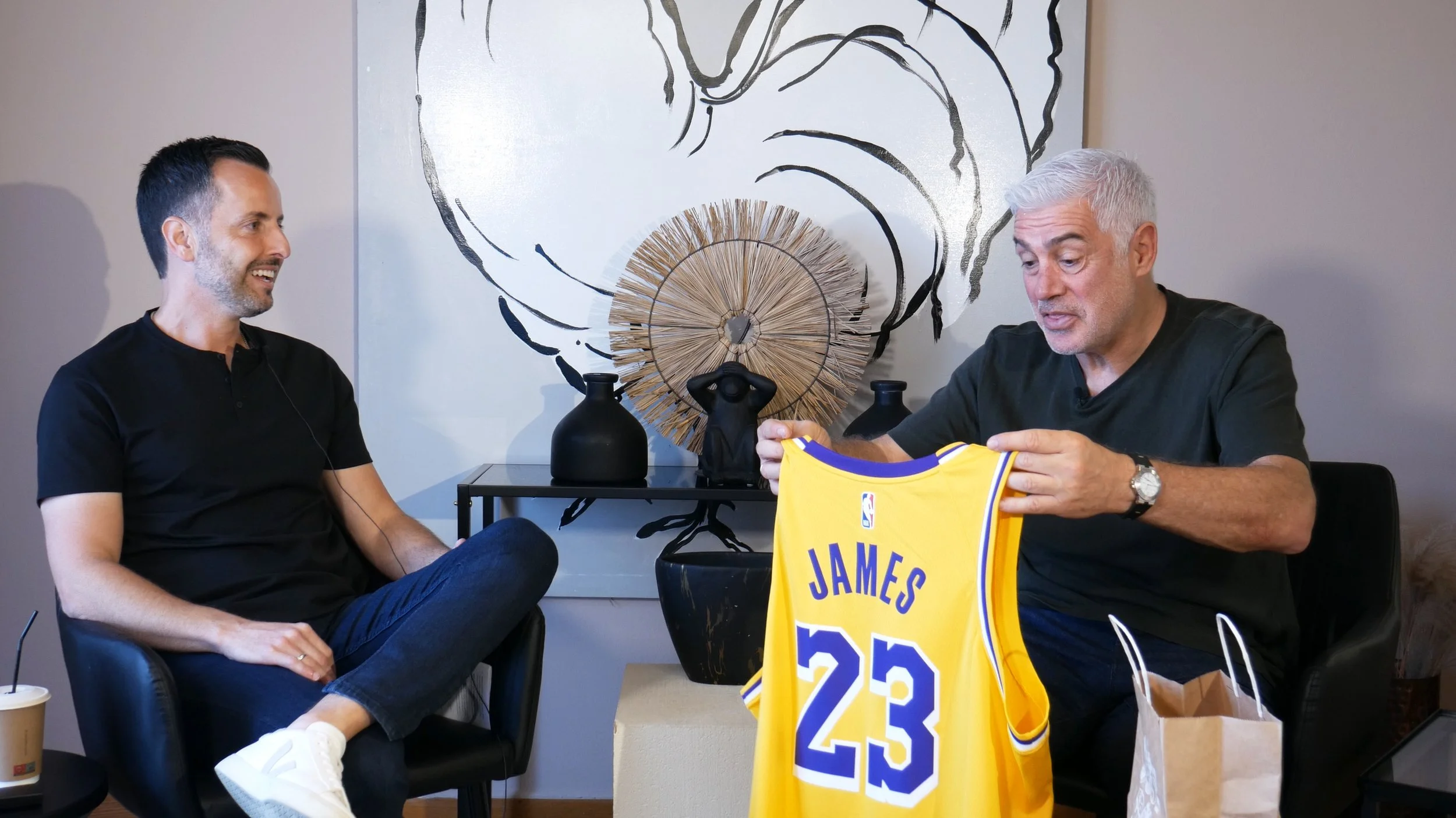 Antonis Nikopolidis holds up a LeBron James LA Lakers jersey gifted by George Stroumboulis, symbolizing respect between champions and representing the city of Los Angeles, where George currently resides.